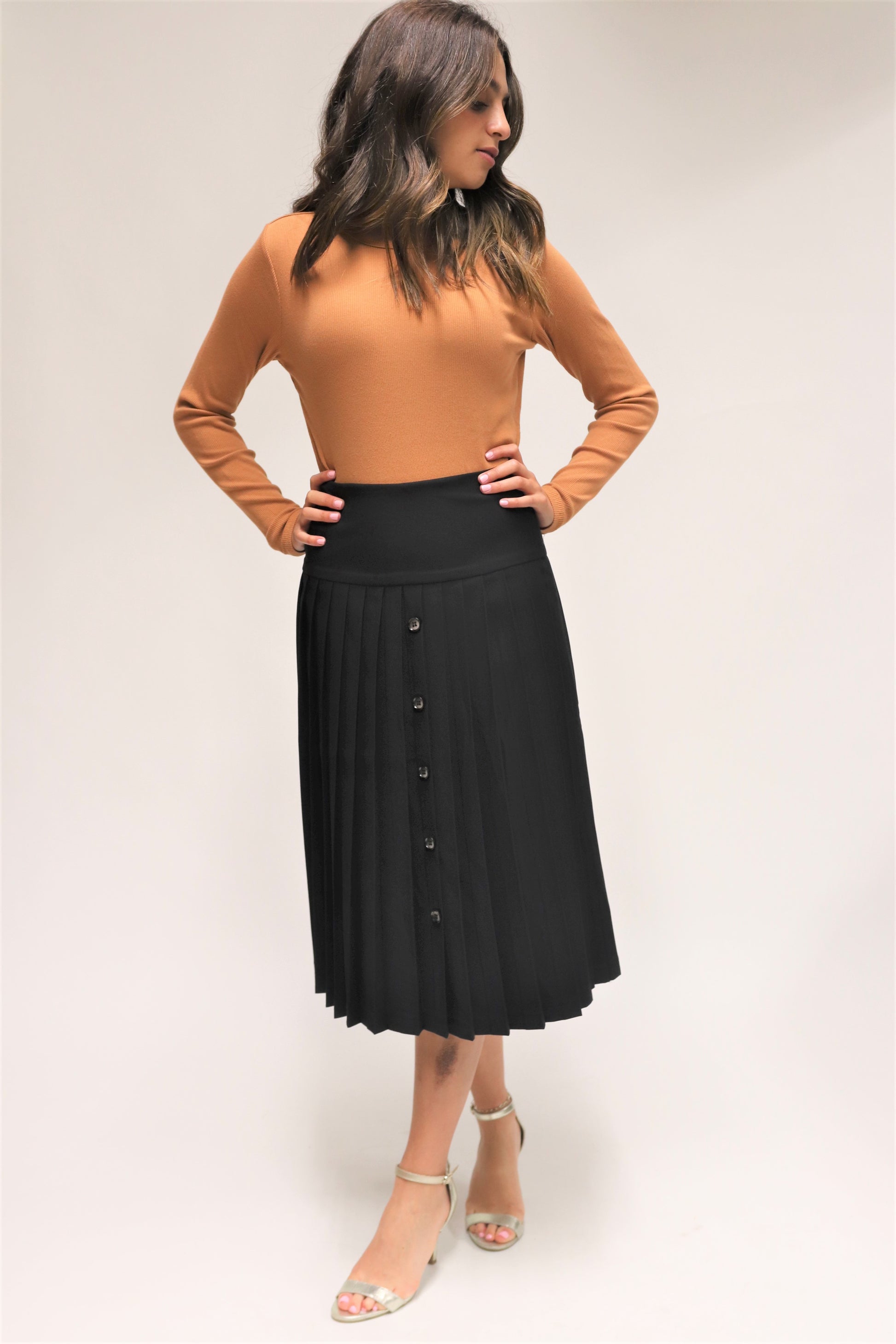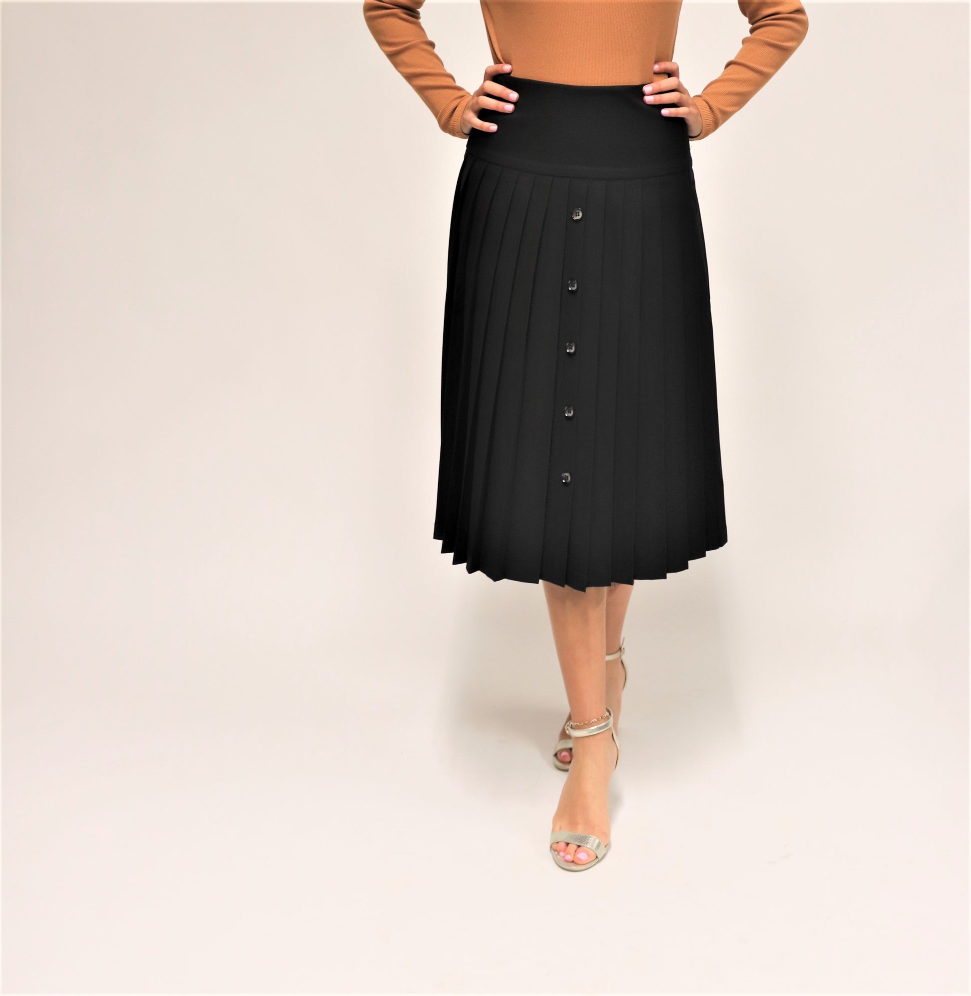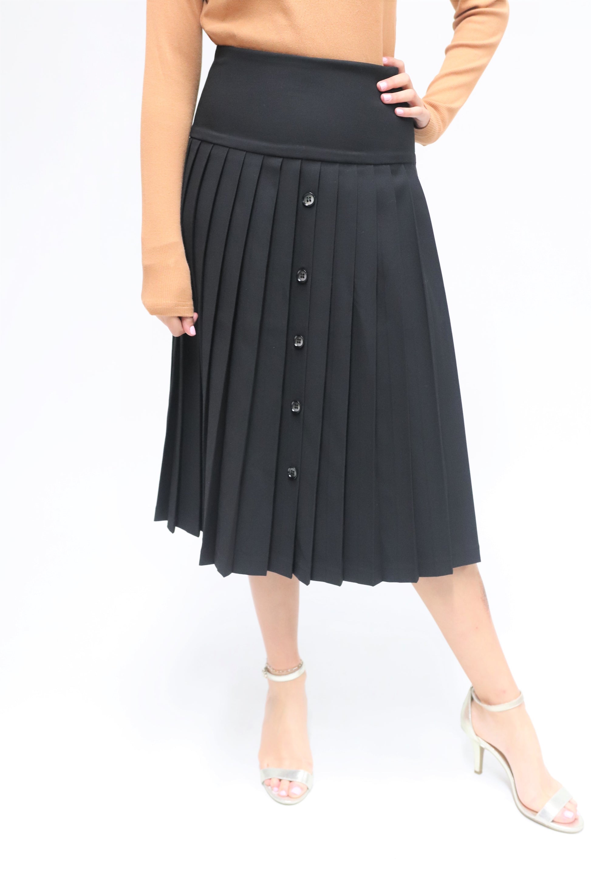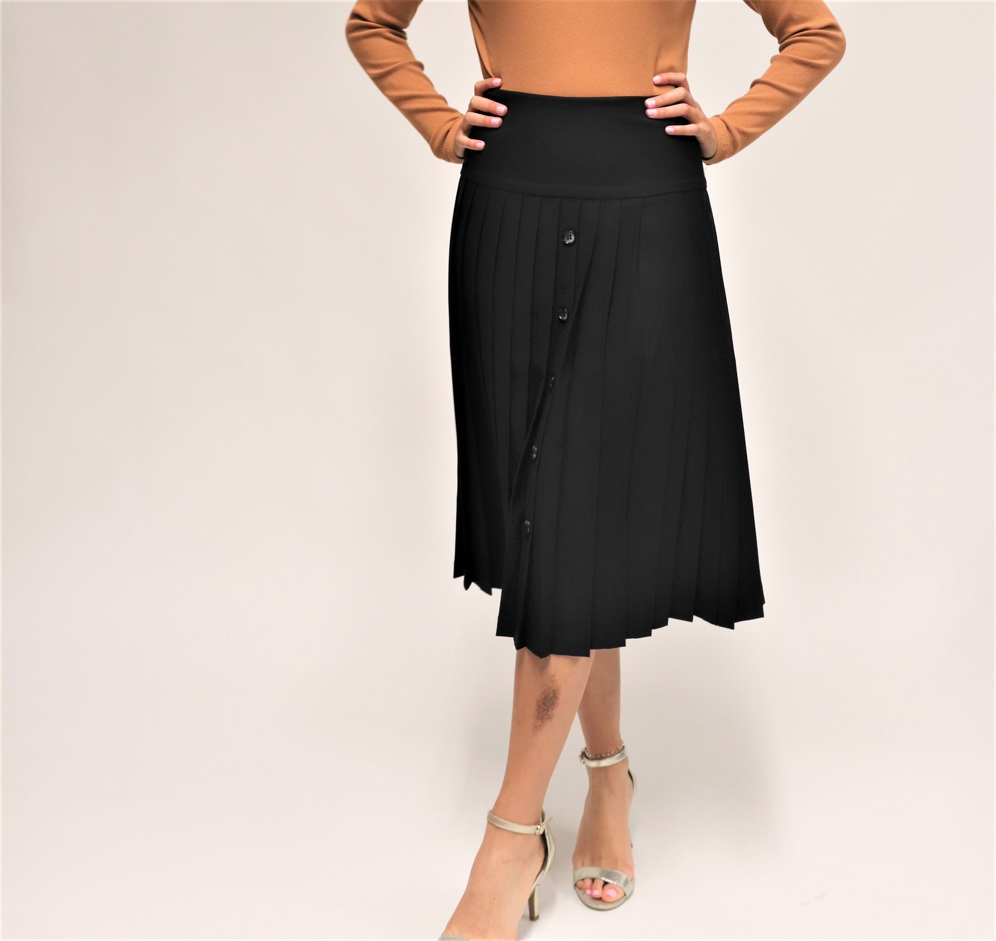 Perfect for everyday and special occasions. Stunning pleats dressy fabric buttons are mother of pearl and are not functional. Side zip closure but fabric has a bit of stretch to be very comfortable. Available in both 25", 27" and 29" length . (Pictured here is 27" length)
